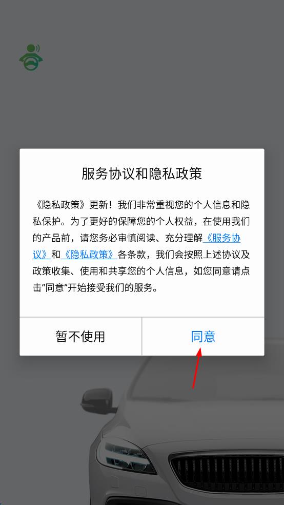 1、打開該汽車相關(guān)APP,在服務(wù)協(xié)議和隱私政策彈窗中點(diǎn)擊同意。