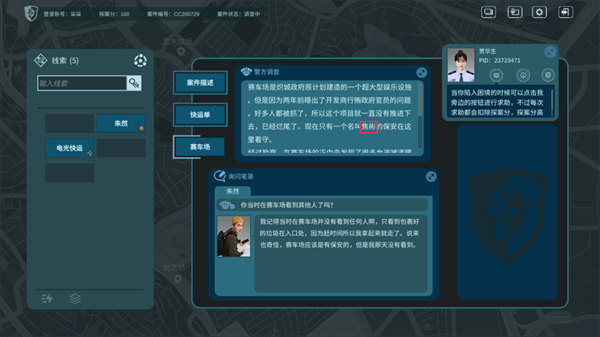 5、從賽車場線索中分析得出嫌疑人【焦彬】,獲得【焦彬信息、朱然有關(guān)焦彬的記錄】;