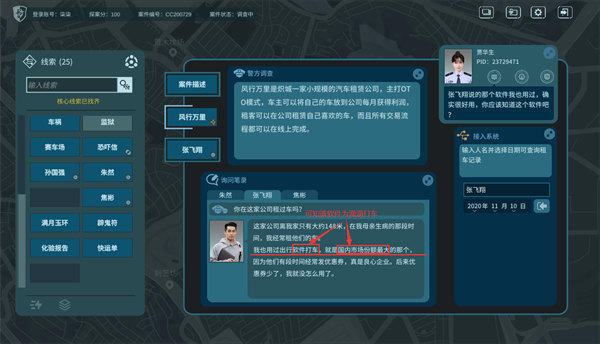 9、再回到恐嚇信上,可以獲得【沃斯拉轎車】【風(fēng)行萬里公司】線索——【打車】線索,根據(jù)死者死亡時(shí)間,就可以在租車公司的租車記錄查詢到兇手為【張飛翔】。