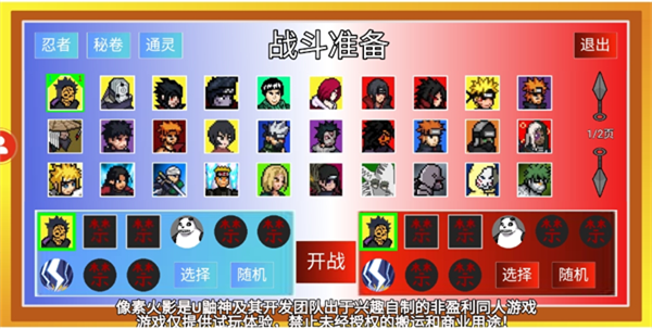 3、在這里可以進(jìn)行戰(zhàn)斗前的準(zhǔn)備,支持選擇多個不同的忍者和秘卷、通靈等,選擇好直接開戰(zhàn)吧;