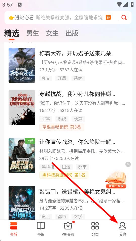 1、打開小說閱讀類APP,點(diǎn)擊底部導(dǎo)航欄最右側(cè)的我的選項。