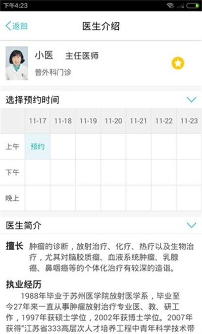 1、每個醫(yī)院的醫(yī)生都是有著詳細的介紹和時間的,查看每個時間醫(yī)生是否預約成功。