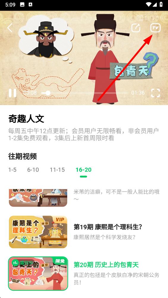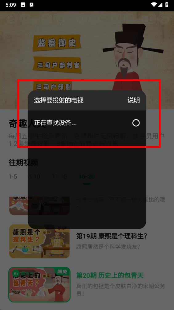 3、進入需要投屏的視頻后點擊視頻界面右上角TV投屏圖標(biāo),等待軟件查找投屏設(shè)備。