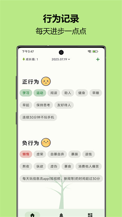 3、可以看到自己每天記錄的行為歷史,也能更好的監(jiān)督自己的行為,進(jìn)行扣分處理。