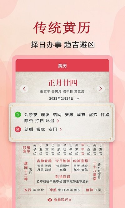 1、可以查看傳統(tǒng)的黃歷,看到每天的時辰和宜忌,讓年輕人都可以了解當(dāng)天的運勢。