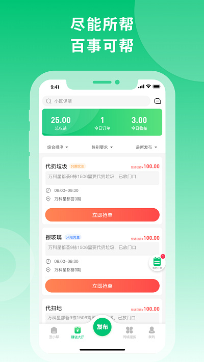 1、軟件上面有很多生活服務(wù),可以在軟件上面查看各種扔垃圾這種小訂單,獲取少量的利益。