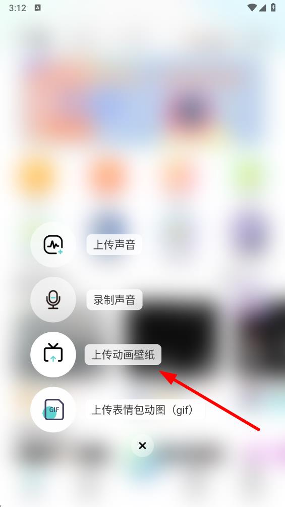 2、在彈出的菜單中,有多種分享選項,點擊上傳動畫壁紙選項,進入作品上傳準備頁面。