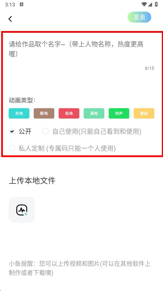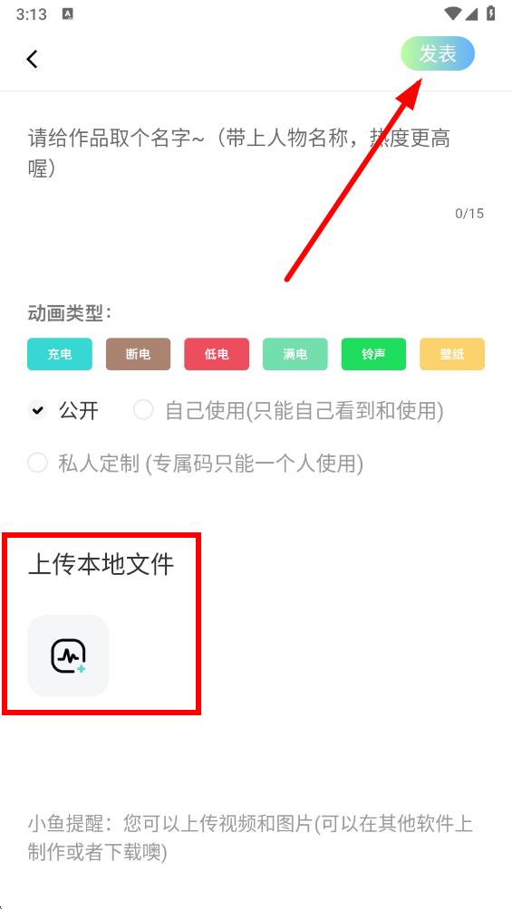 4、點擊上傳本地文件區(qū)域,選擇要上傳的動畫壁紙文件,確認信息無誤后點擊右上角發(fā)表按鈕,即可完成作品上傳。