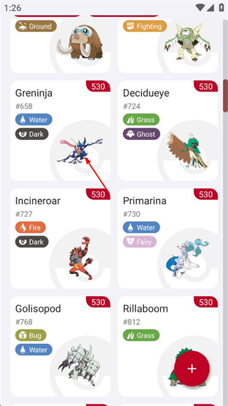 1、打開寶可夢信息查詢軟件,在寶可夢列表中找到甲賀忍蛙并點擊,進入其詳情界面。