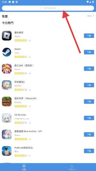1、完成GamesToday安裝后啟動(dòng),進(jìn)入首頁,默認(rèn)展示熱門推薦游戲列表,找到搜索欄,進(jìn)入搜索界面。