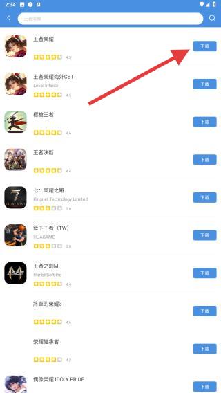 3、搜索結(jié)果列表會(huì)顯示游戲圖標(biāo)、名稱、評(píng)分、廠商信息,核對后點(diǎn)擊對應(yīng)條目,進(jìn)入游戲詳情頁,確認(rèn)版本如國際服、漢化版,點(diǎn)擊下載按鈕。