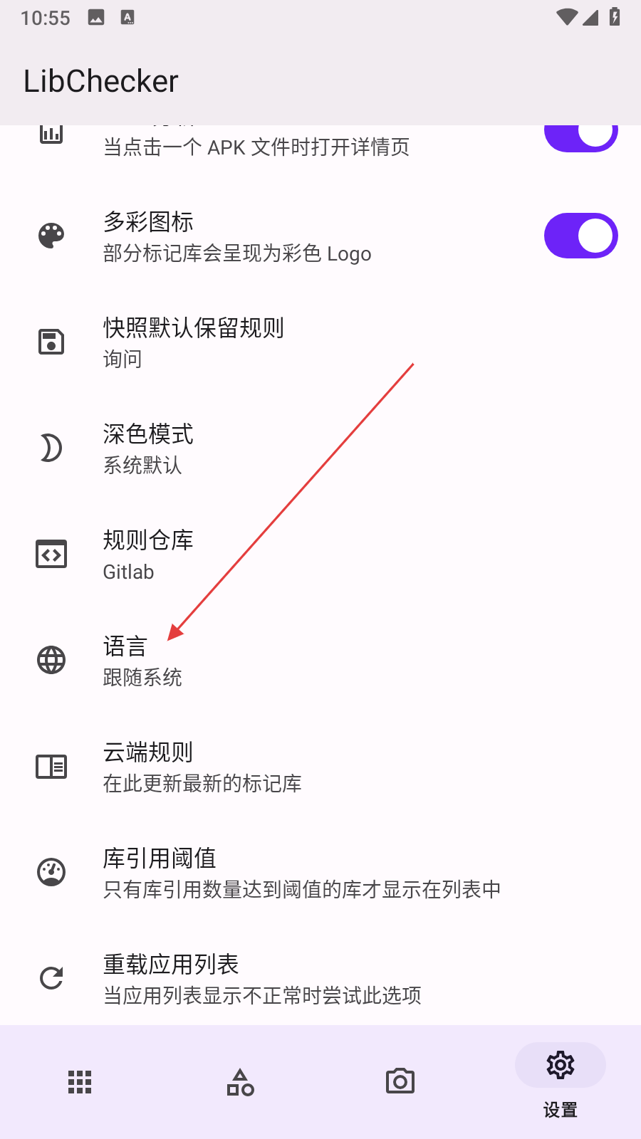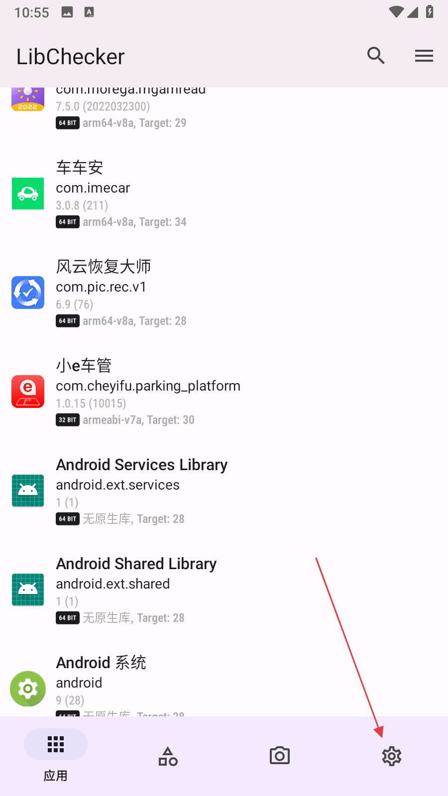 1、打開LibChecker應(yīng)用,點擊底部導(dǎo)航欄最右側(cè)的齒輪形狀設(shè)置圖標,進入設(shè)置頁面。