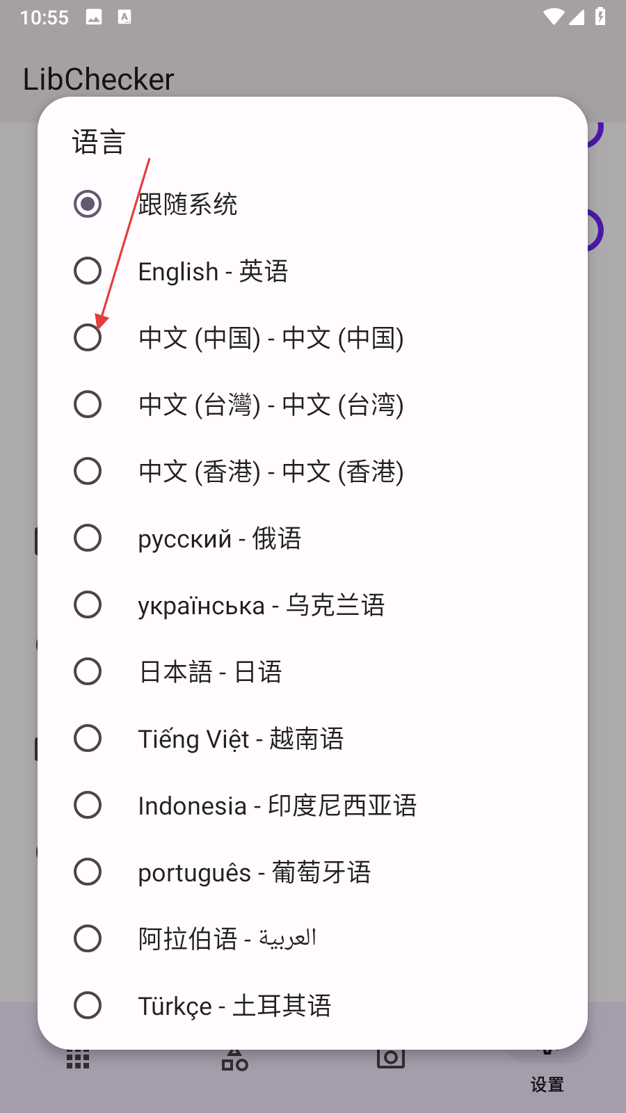 3、在選擇框中點擊中文(中國)-中文(中國)選項,即可將LibChecker的界面語言切換為中文。