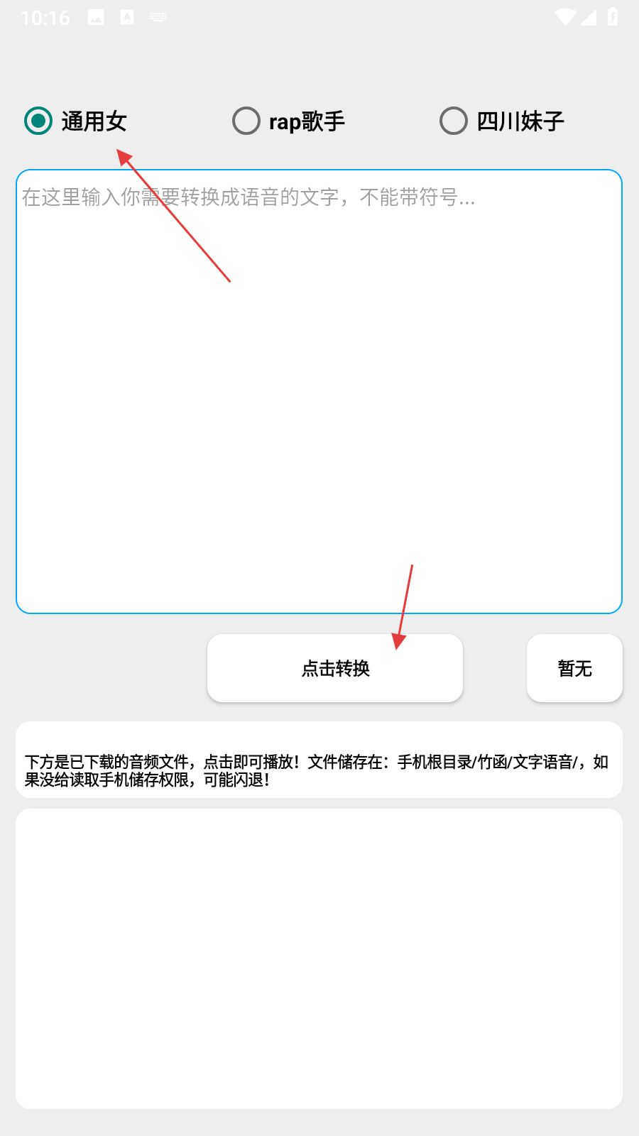 2、選擇語音類型,在輸入框中輸入需要轉(zhuǎn)換的文字,點(diǎn)擊點(diǎn)擊轉(zhuǎn)換按鈕。