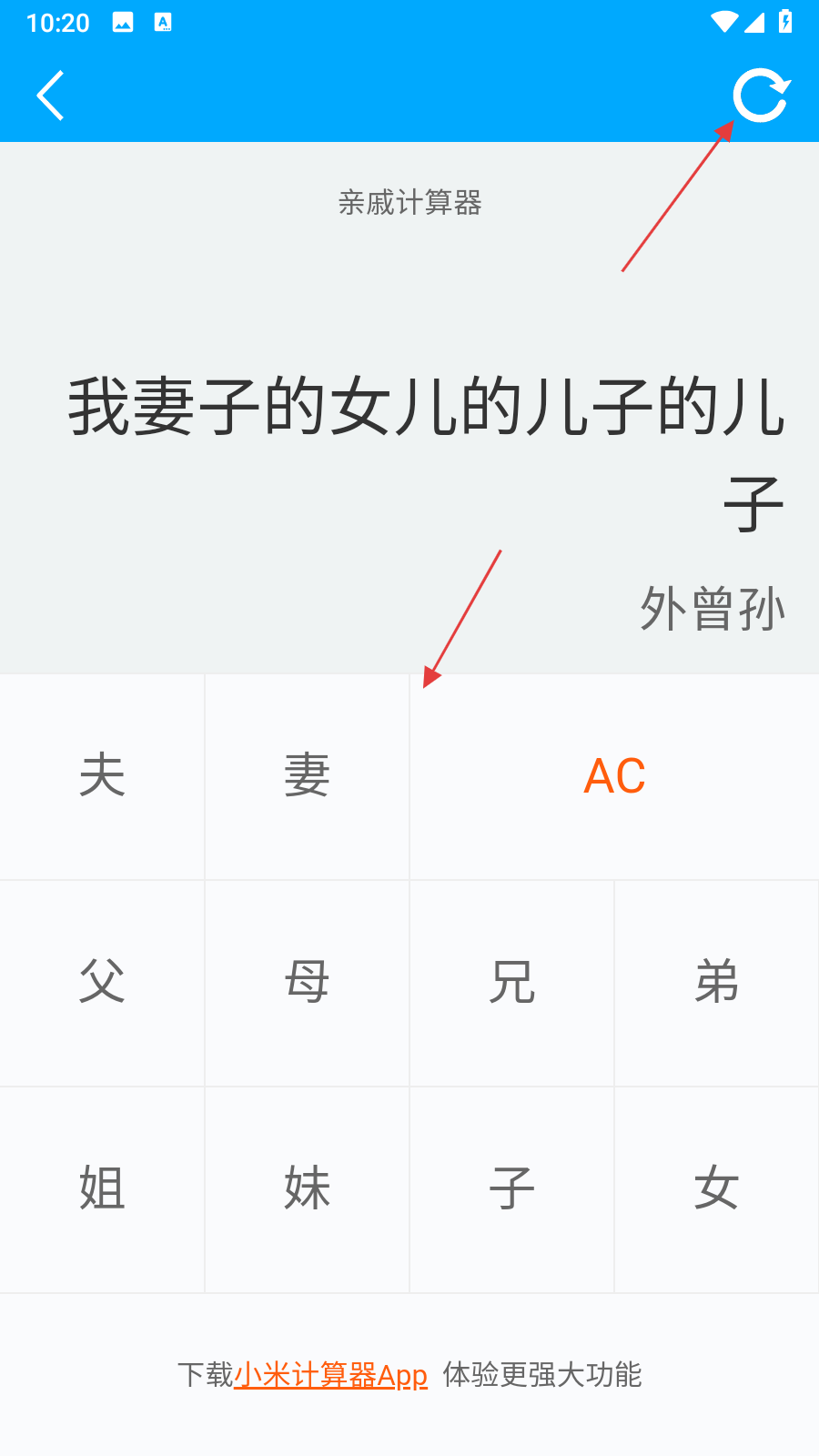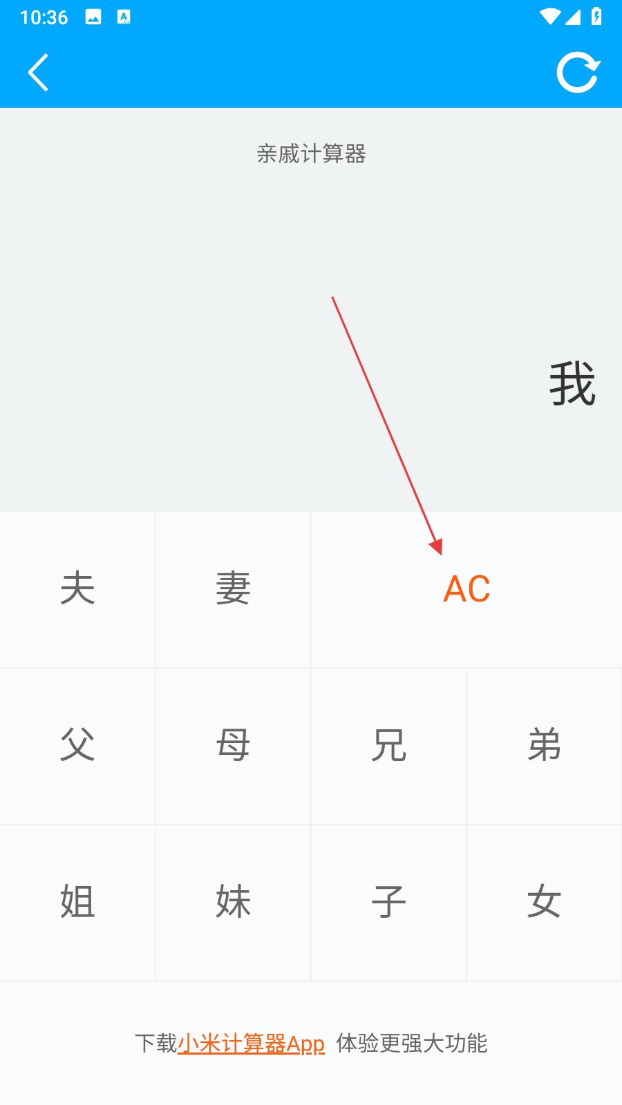 3、若需重新計(jì)算,點(diǎn)擊AC按鈕清除當(dāng)前關(guān)系,或點(diǎn)擊右上角刷新圖標(biāo)重置,再重復(fù)步驟2操作。