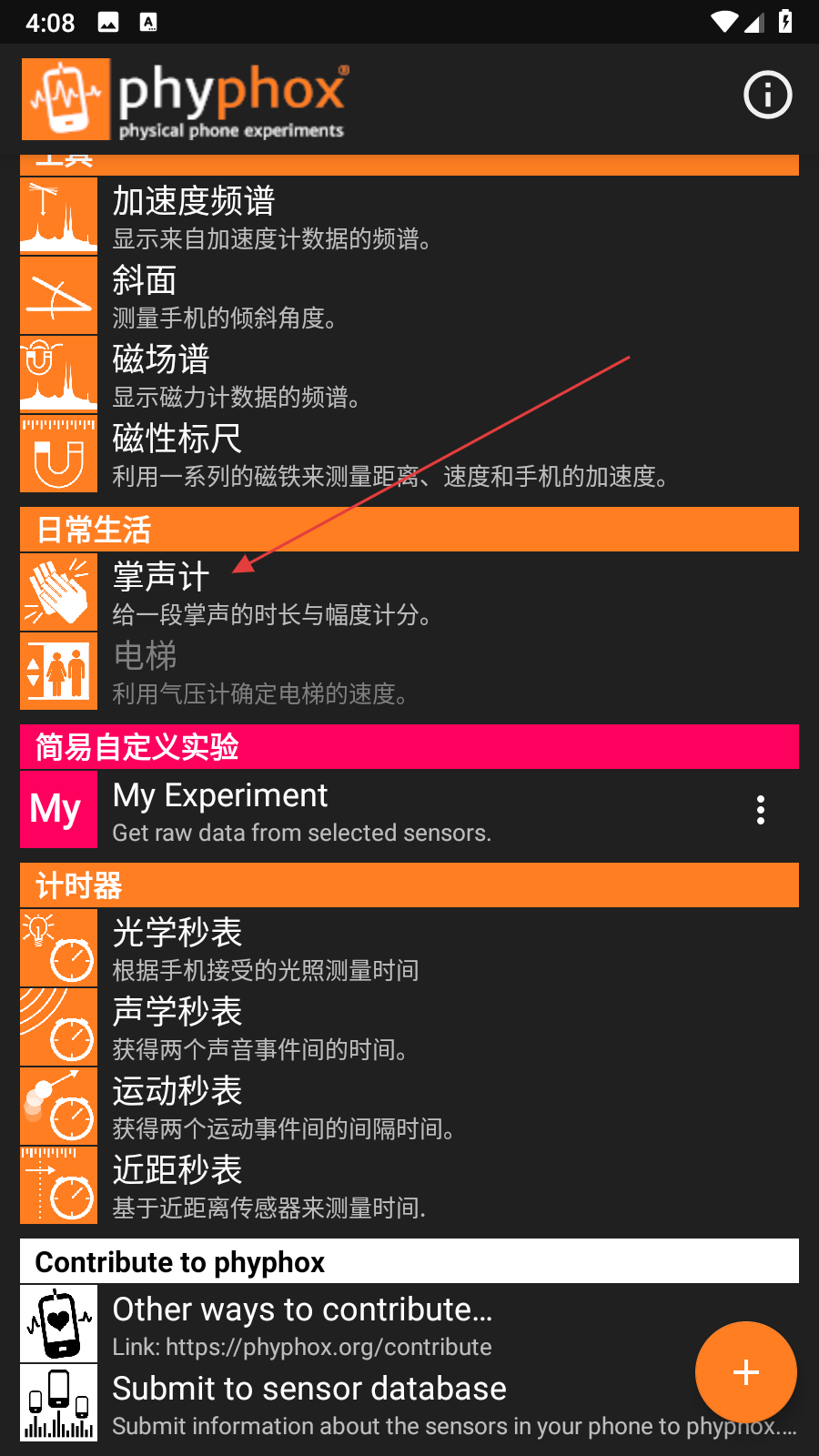 1、打開手機(jī)物理工坊應(yīng)用,在主界面找到日常生活分類,點擊掌聲計選項,進(jìn)入掌聲計功能界面。