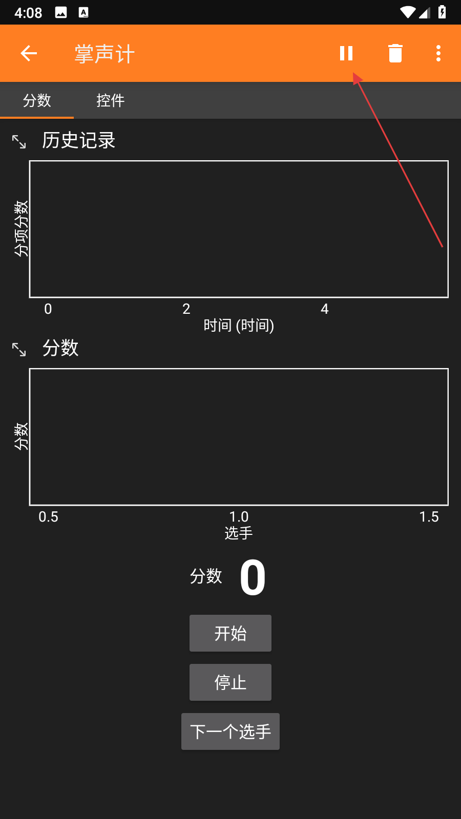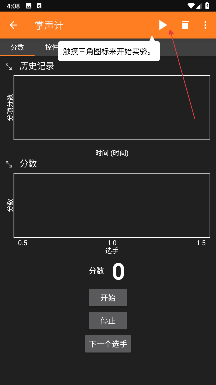 3、實驗過程中可點擊暫停圖標(biāo)暫停計時,結(jié)束后查看歷史記錄圖表和分?jǐn)?shù)顯示,若需切換選手點擊下一個選手按鈕,繼續(xù)為其他選手的掌聲計分。