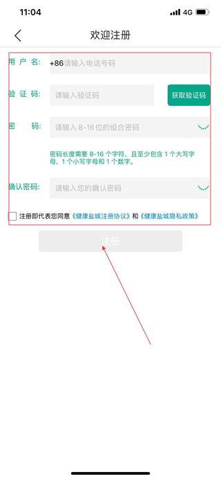 4、輸入手機(jī)號碼、驗(yàn)證碼、密碼,勾選協(xié)議后點(diǎn)擊注冊。