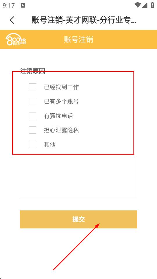 7、在注銷原因頁面,勾選注銷原因,點擊提交,完成賬號注銷。