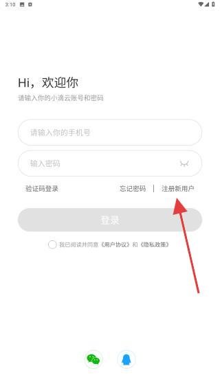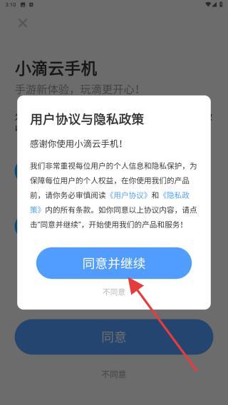 1、打開(kāi)小滴云手機(jī)APP,進(jìn)入時(shí)會(huì)彈出用戶協(xié)議與隱私政策,點(diǎn)擊同意并繼續(xù)的按鈕。