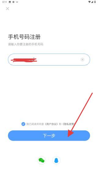 3、進(jìn)入注冊(cè)的界面內(nèi),輸入要注冊(cè)的手機(jī)號(hào)后,點(diǎn)擊下一步的按鈕。