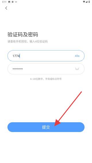 4、將收到的驗(yàn)證碼、密碼輸入進(jìn)去后,點(diǎn)擊提交的按鈕即可完成注冊(cè)。