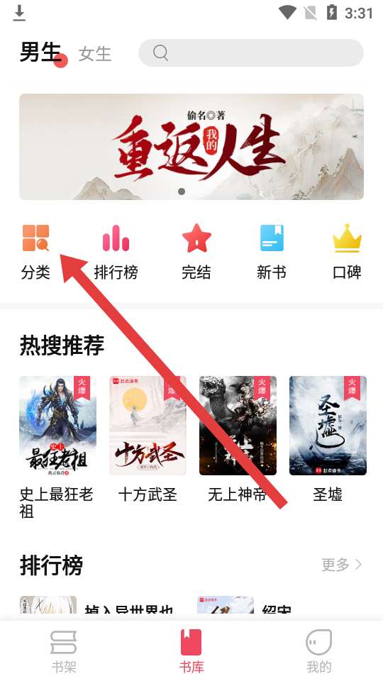 1、打開樹莓閱讀APP,點擊進入底部書庫,再找到分類按鈕,點擊進入分類。