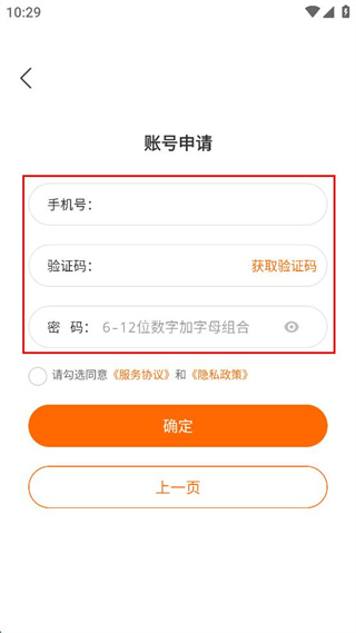 3、進(jìn)入下一賬號(hào)申請(qǐng)界面,輸入手機(jī)號(hào)、驗(yàn)證碼、密碼。