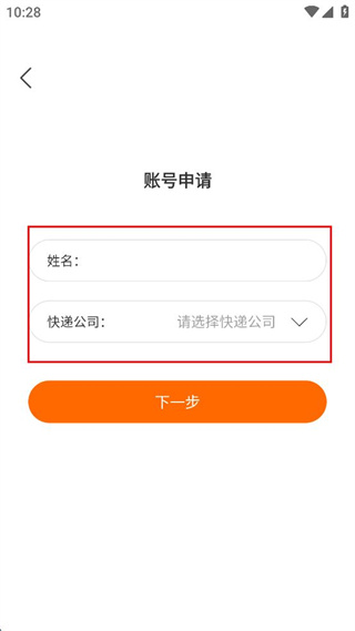 2、在賬號(hào)申請(qǐng)界面,輸入姓名,選擇快遞公司后點(diǎn)擊下一步。