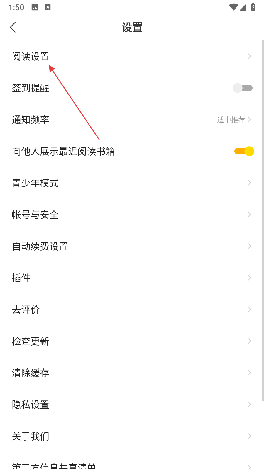 3、在設置界面里,點擊閱讀設置選項,進入閱讀設置頁面。