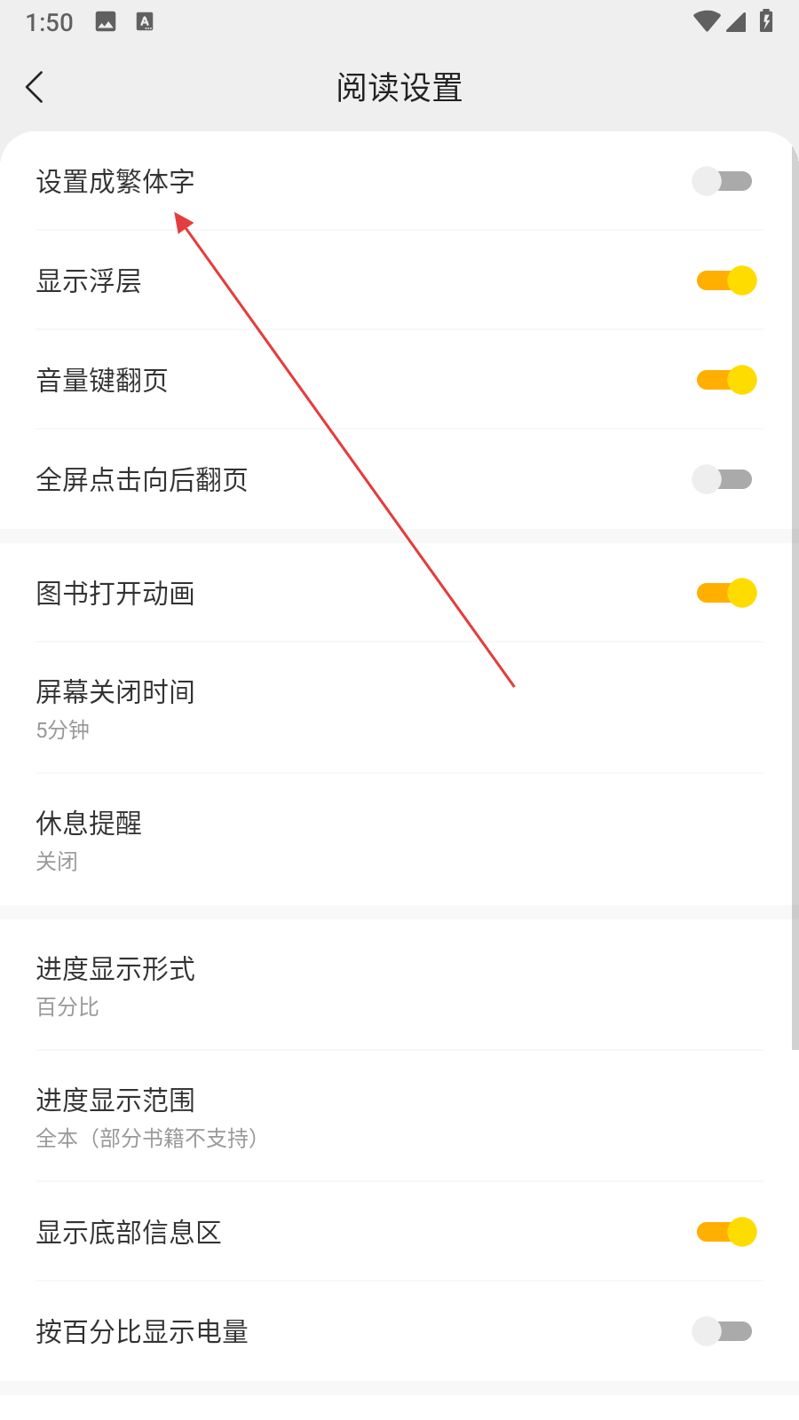 4、在閱讀設置頁面中,找到設置成繁體字的開關,點擊開啟該開關。