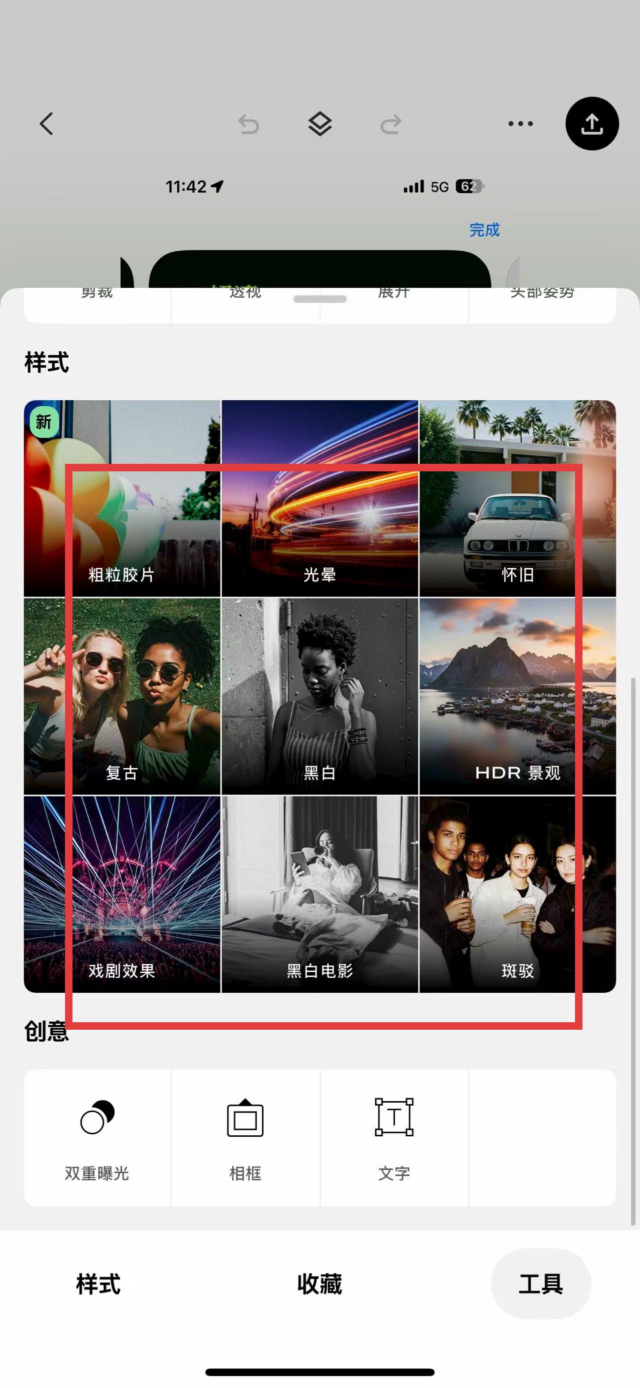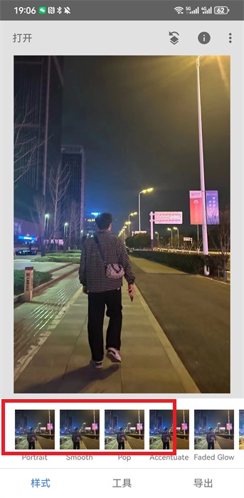 2、切換到樣式頁,挑選粗粒膠片、光暈等預設(shè)風格,一鍵賦予照片獨特氛圍,快速改變畫面格調(diào)。