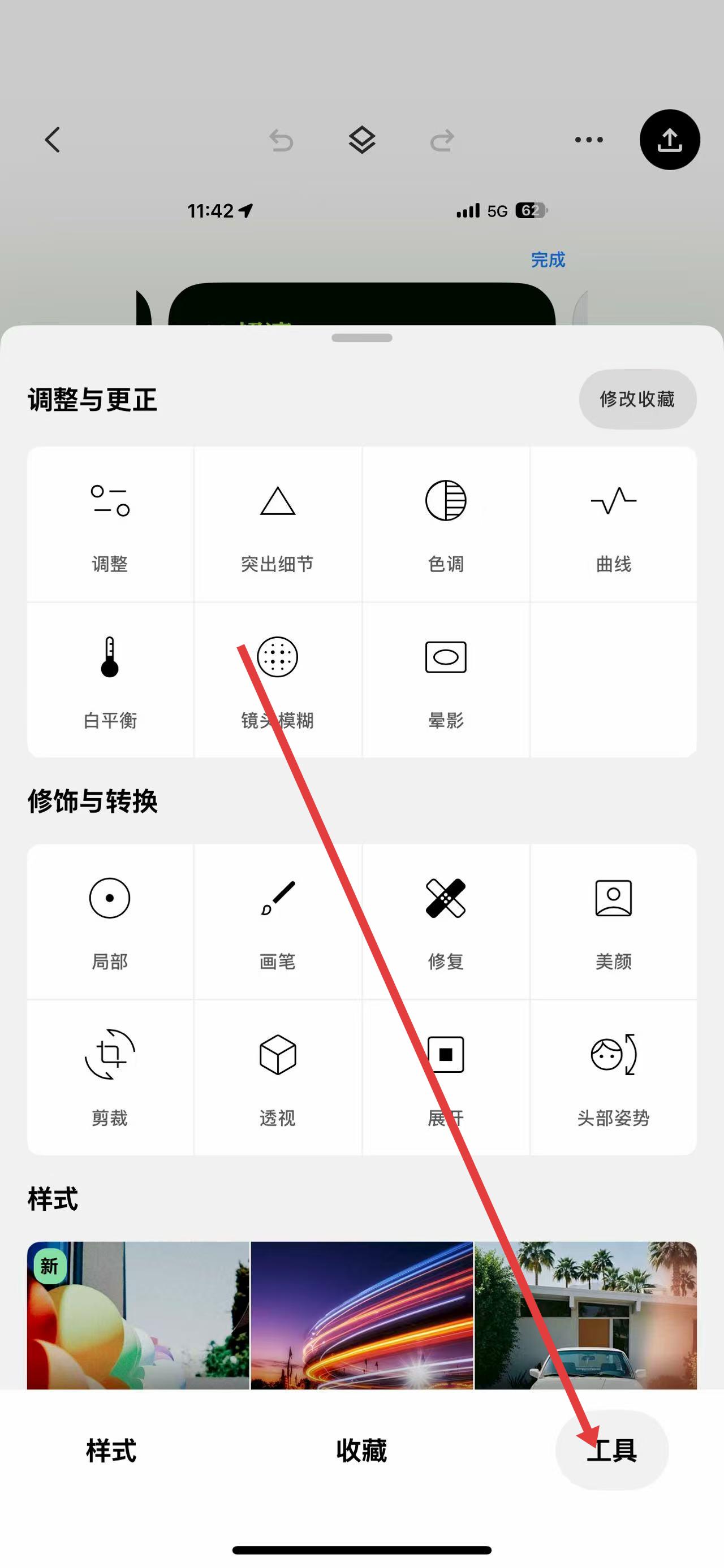 1、打開修圖APP,進入編輯界面后點擊工具,可選擇調(diào)整與更正、修飾與轉(zhuǎn)換等工具,初步優(yōu)化畫面。