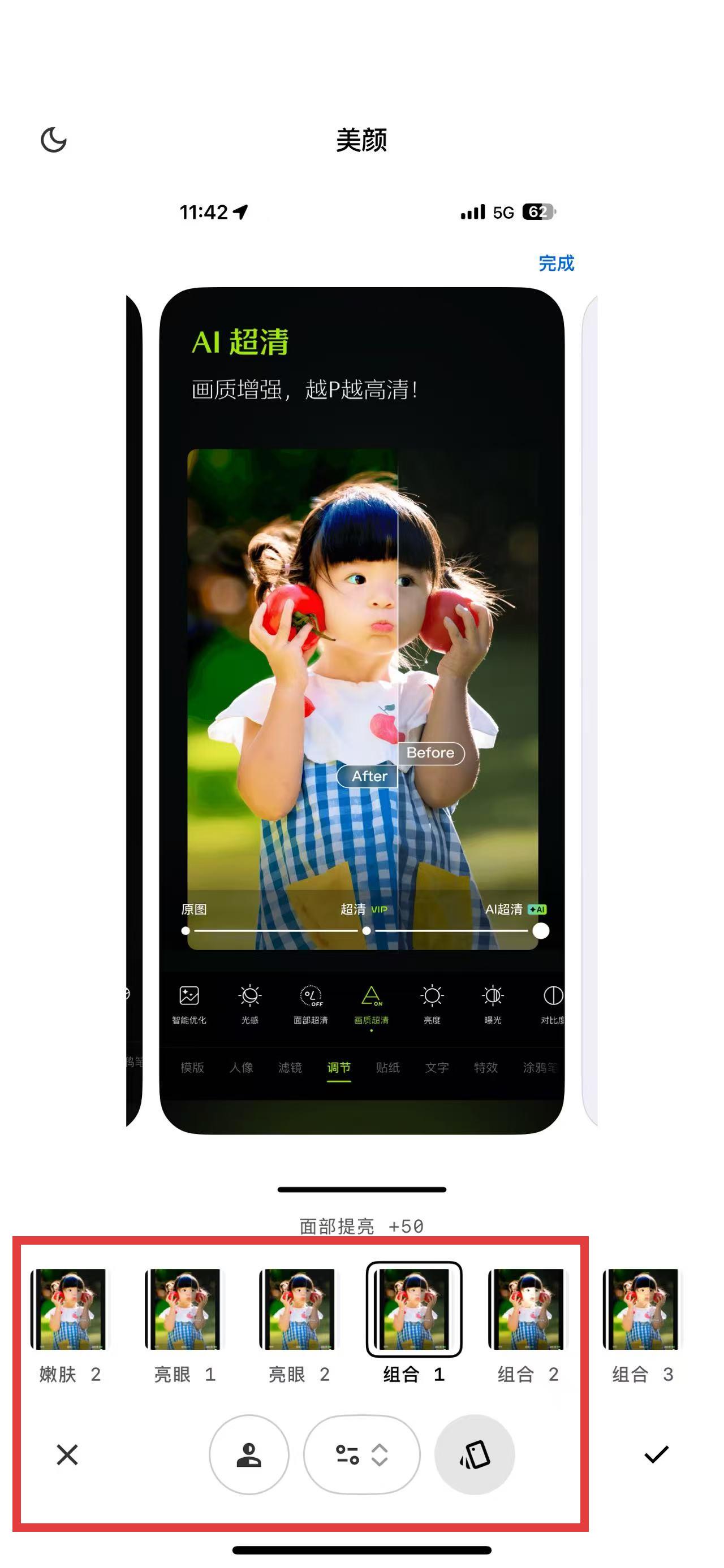 3、點擊美顏功能,選擇嫩膚、亮眼等組合效果,優(yōu)化人像面部細節(jié),讓人物更出彩,完成后保存作品即可。