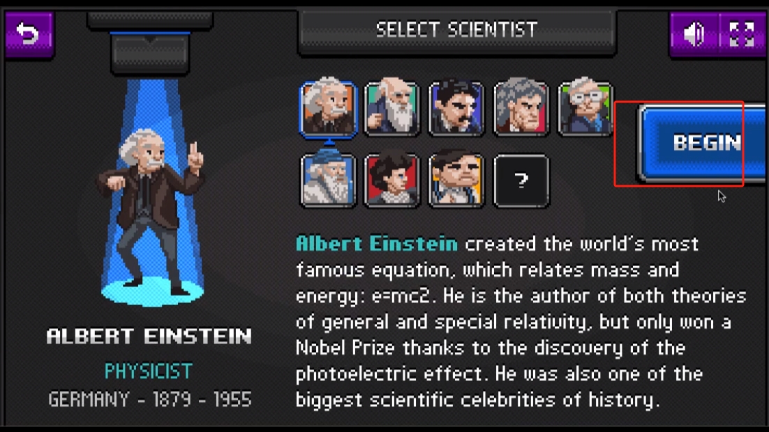 1、在游戲中可以看到有超多的角色可以選擇,各種角色都有屬于他們的成就介紹,點(diǎn)擊這里選中愛因斯坦進(jìn)行挑戰(zhàn);