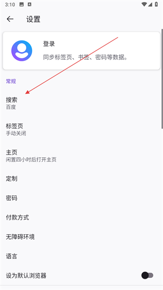 3、進(jìn)入設(shè)置頁面之后,點(diǎn)擊搜索選項(xiàng),進(jìn)入搜索設(shè)置頁面。