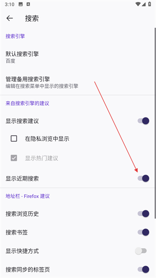 4、點(diǎn)擊顯示近期搜索對應(yīng)的開關(guān)按鈕,將其切換為關(guān)閉狀態(tài)。