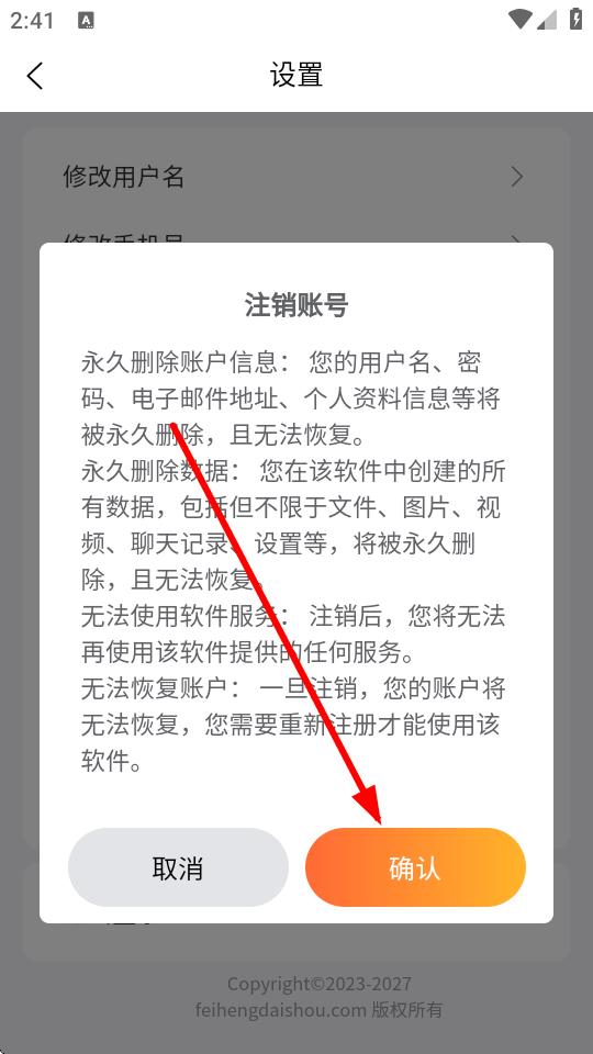 4、在彈出的注銷賬號提示框中,閱讀相關(guān)提示后,點擊確認(rèn)按鈕,即可注銷賬號。