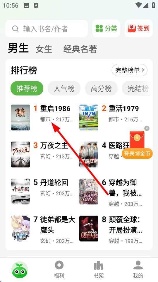 1、打開綠豆小說app,在首頁排行榜的推薦榜里點(diǎn)擊小說重啟1986。
