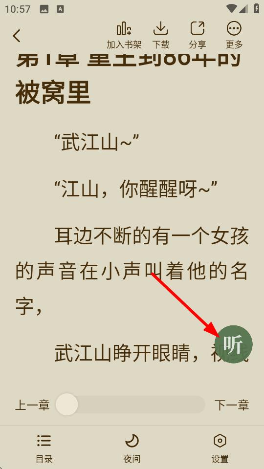 3、在小說閱讀界面中,點(diǎn)擊右下角綠色的聽字按鈕。