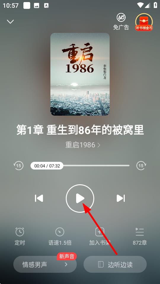 4、進(jìn)入聽書播放界面后,點(diǎn)擊中間的播放按鈕即可開始聽書。