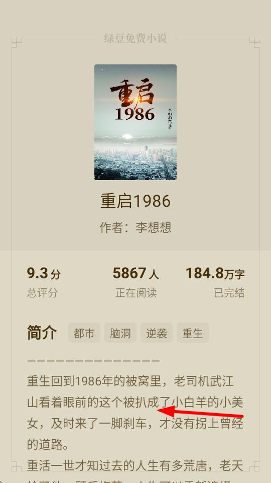2、進(jìn)入重啟1986小說詳情頁,下滑查看簡介后點(diǎn)擊頁面進(jìn)入閱讀界面。