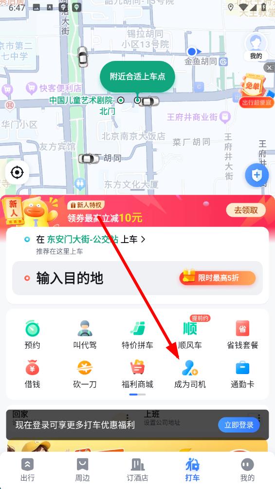 2、在打車界面里,找到并點擊成為司機(jī)的按鈕,進(jìn)入司機(jī)注冊相關(guān)頁面。