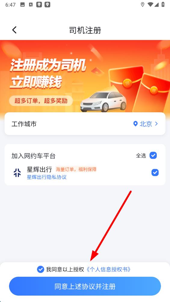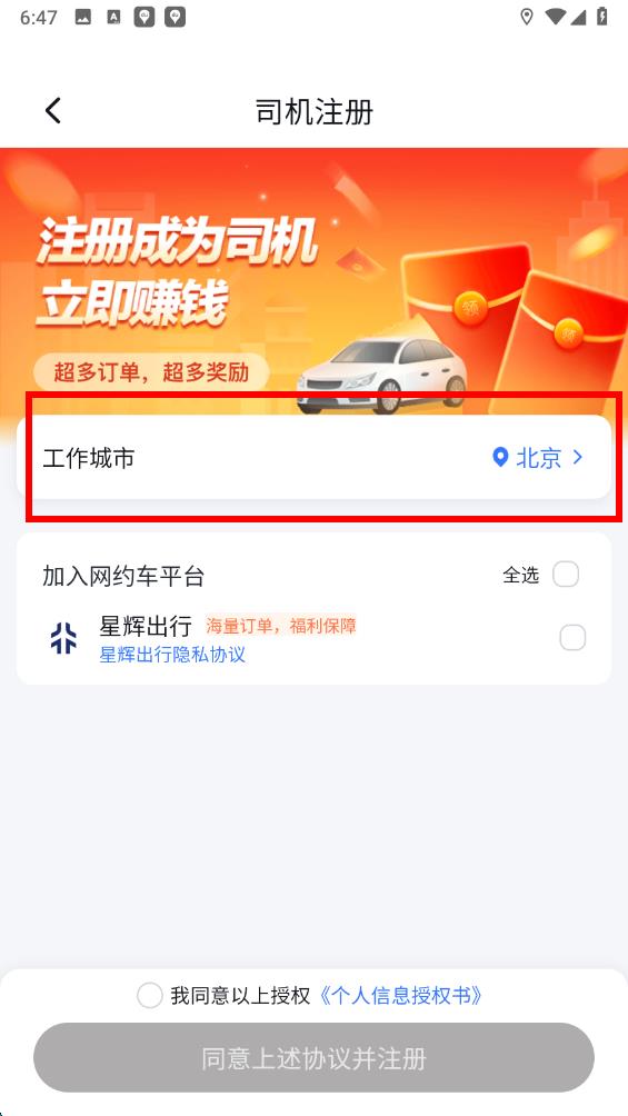 4、選擇想要加入的網(wǎng)約車平臺,勾選平臺對應(yīng)的隱私協(xié)議,最后點擊同意上述協(xié)議并注冊,按后續(xù)提示完成注冊流程即可接單。