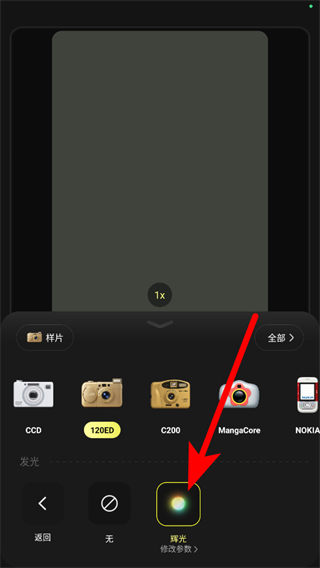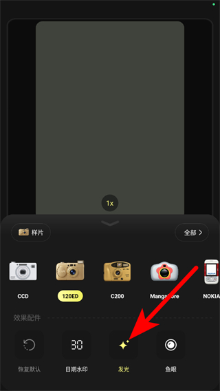 3.相機(jī)選擇完成后,可點(diǎn)擊發(fā)光效果配件,選擇“輝光”等發(fā)光效果。