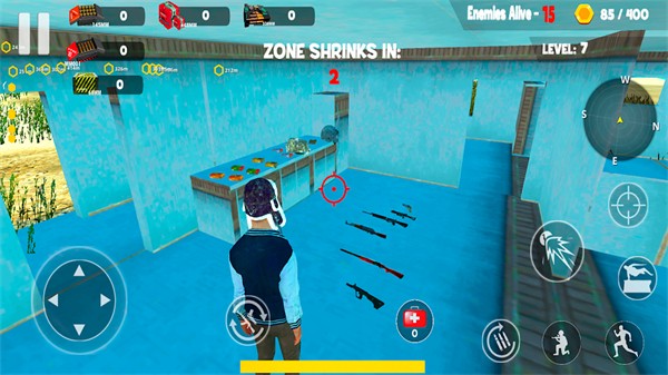 2、不同的武器有著不同的射程、射速和傷害值,需根據(jù)場景和敵人的特點來選擇;