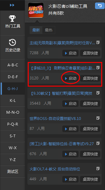 4.在火影忍者OL輔助工具中“啟動(dòng)”“火影忍者ol【承銘】主線|無(wú)限刷副本|懸賞|定時(shí)任務(wù)”