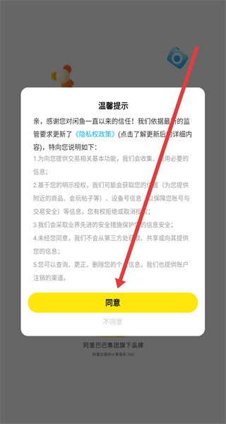 1、在打開閑魚后,點擊同意按鈕,同意隱私權政策后進入首頁。