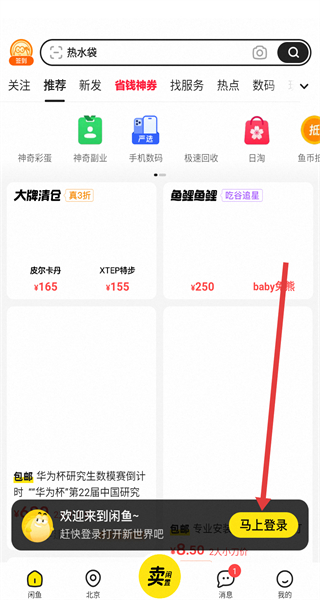2、在進入到閑魚首頁后,可以點擊上方馬上登錄按鈕,觸發(fā)登錄操作。