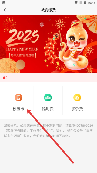 2、當(dāng)我們進(jìn)入教育繳費(fèi)界面后,選擇校園卡選項(xiàng),可進(jìn)行校園卡相關(guān)費(fèi)用的繳納操作。